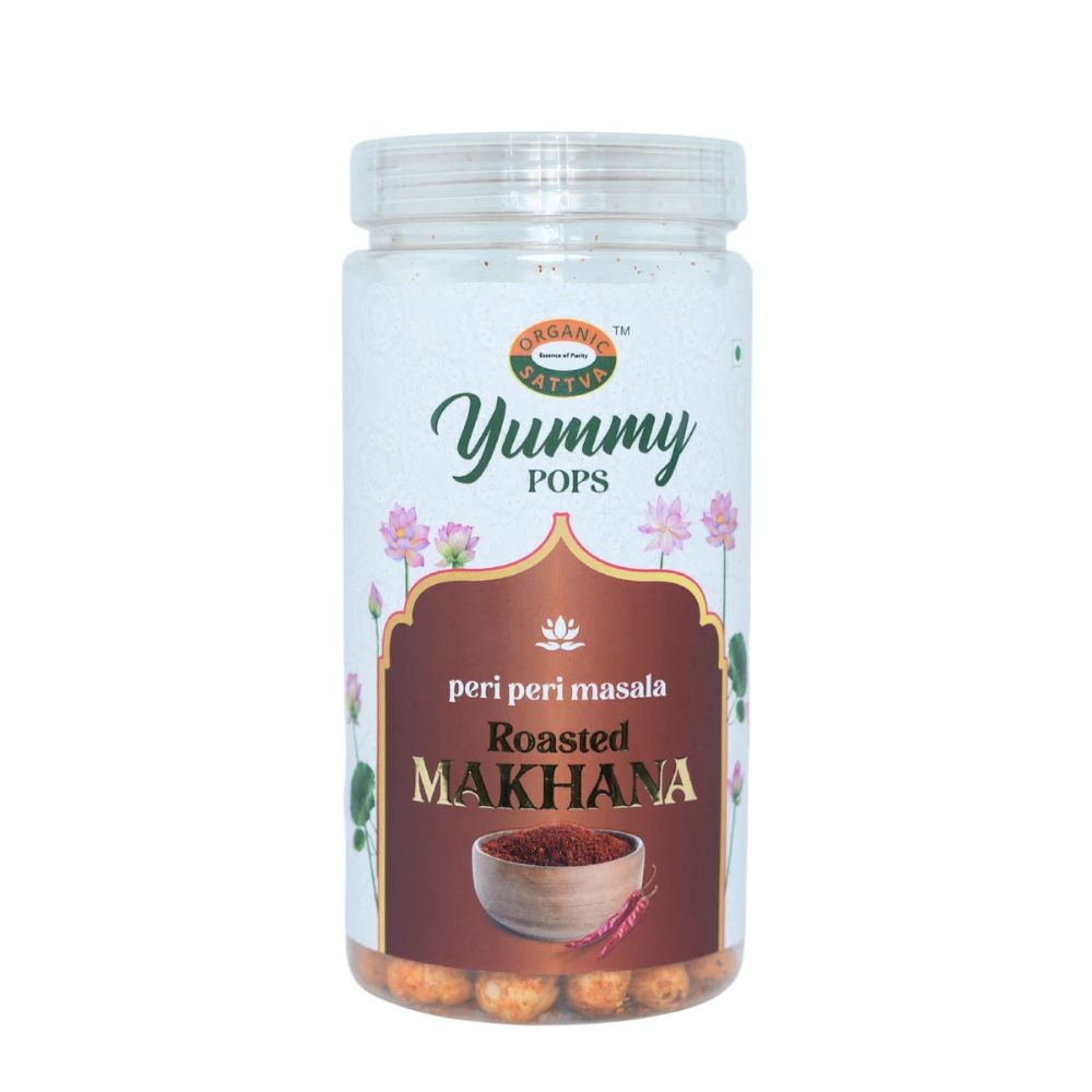 Organic Sattva Peri Peri Flavoured Makhana is a crunchy masala makhana snack made from roasted fox nuts, coated with bold peri peri flavour for a spicy, guilt-free snacking experience.